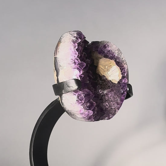 This spectacular amethyst geode specimen displays deep purple crystal formations with sparkling druzy points throughout the natural cavity. The high-quality amethyst cluster features rich violet hues and includes a striking calcite inclusion that adds remarkable contrast to the purple crystals.