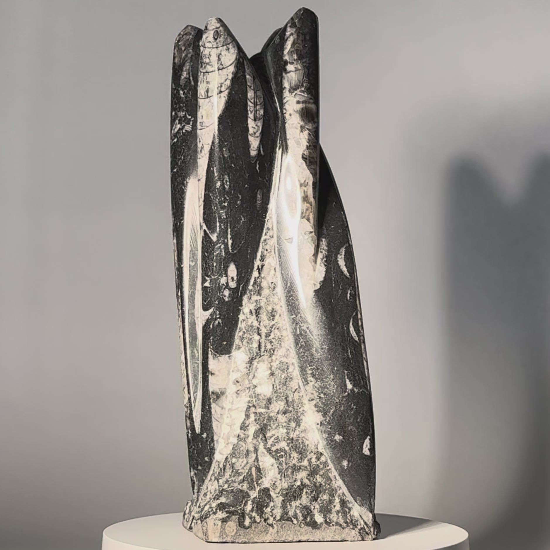 A tower of nautiloid cephalopod (squid/cuttlefish type) fossils. Cut and polished into striking shapes.