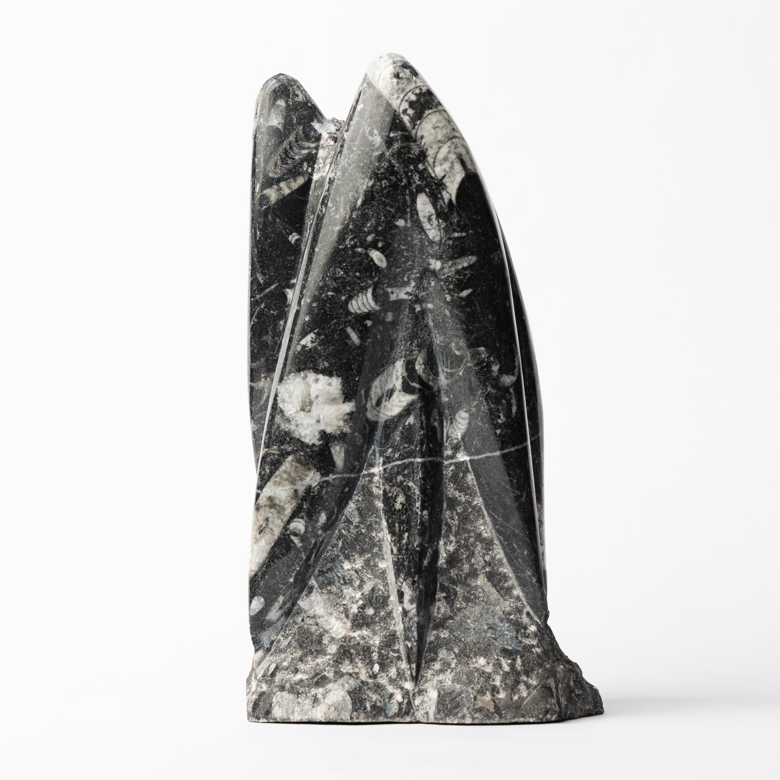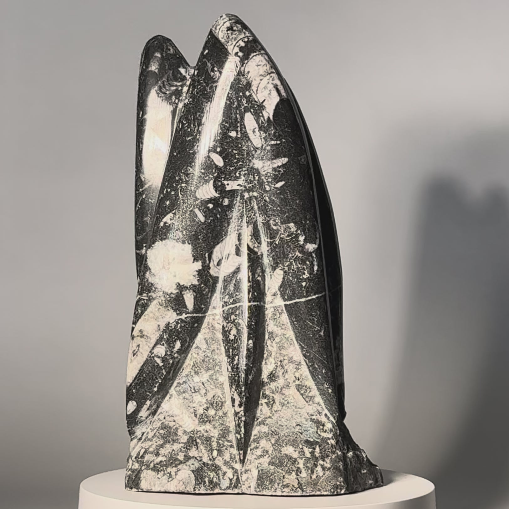 A tower of nautiloid cephalopod (squid/cuttlefish type) fossils. Cut and polished into striking shapes.