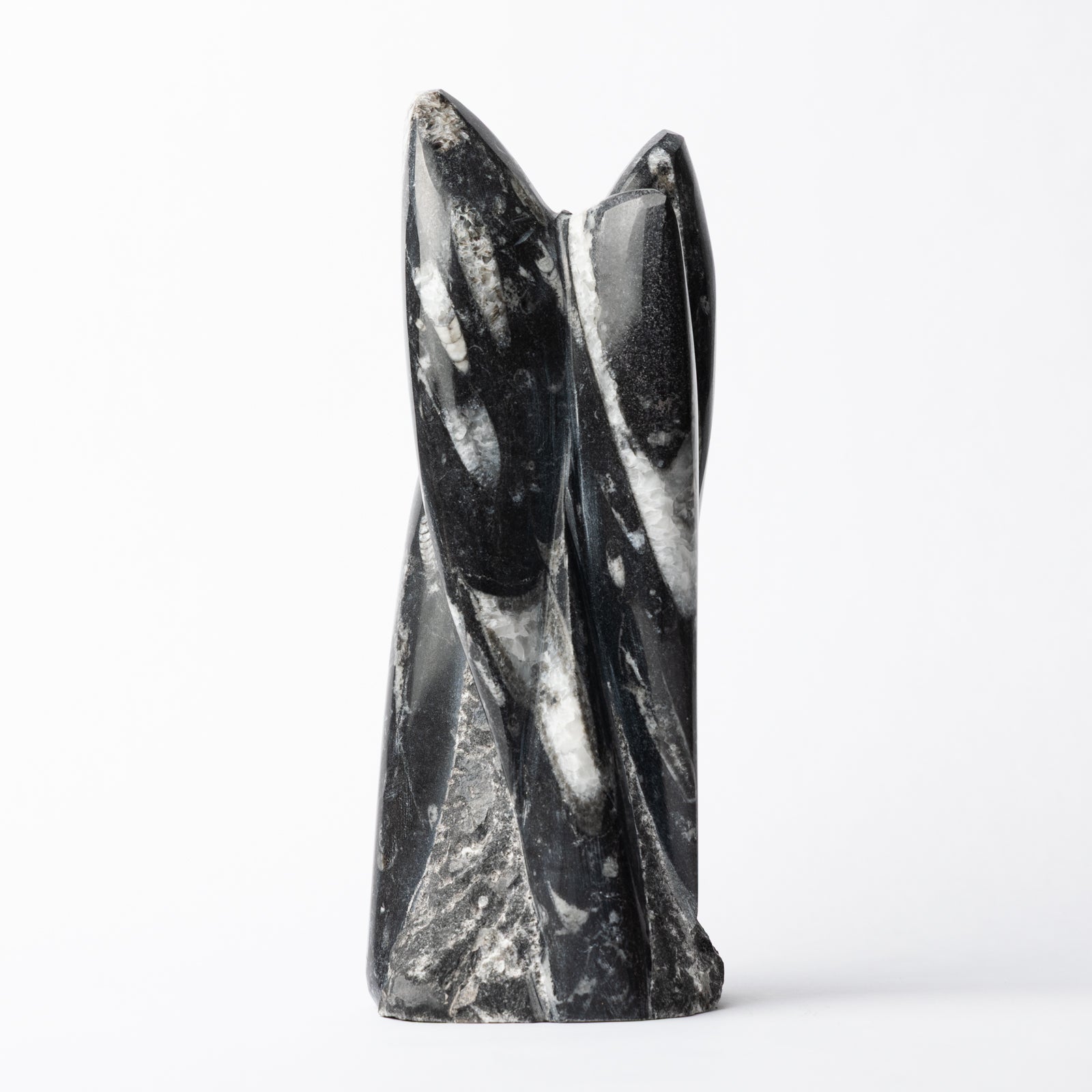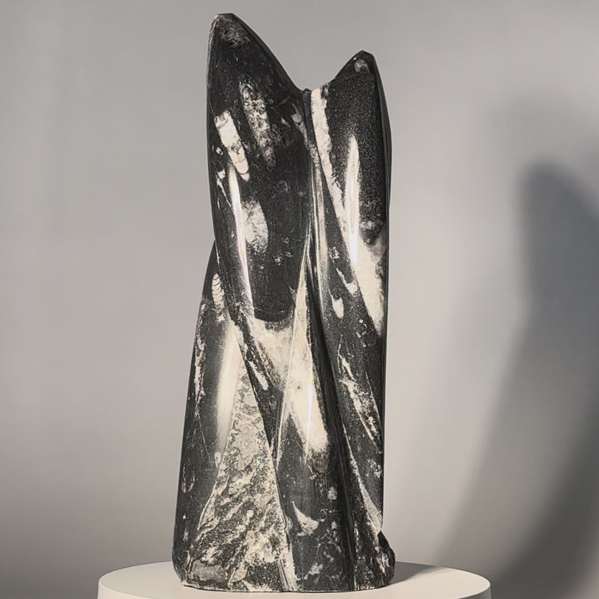 A tower of nautiloid cephalopod (squid/cuttlefish type) fossils. Cut and polished into striking shapes.