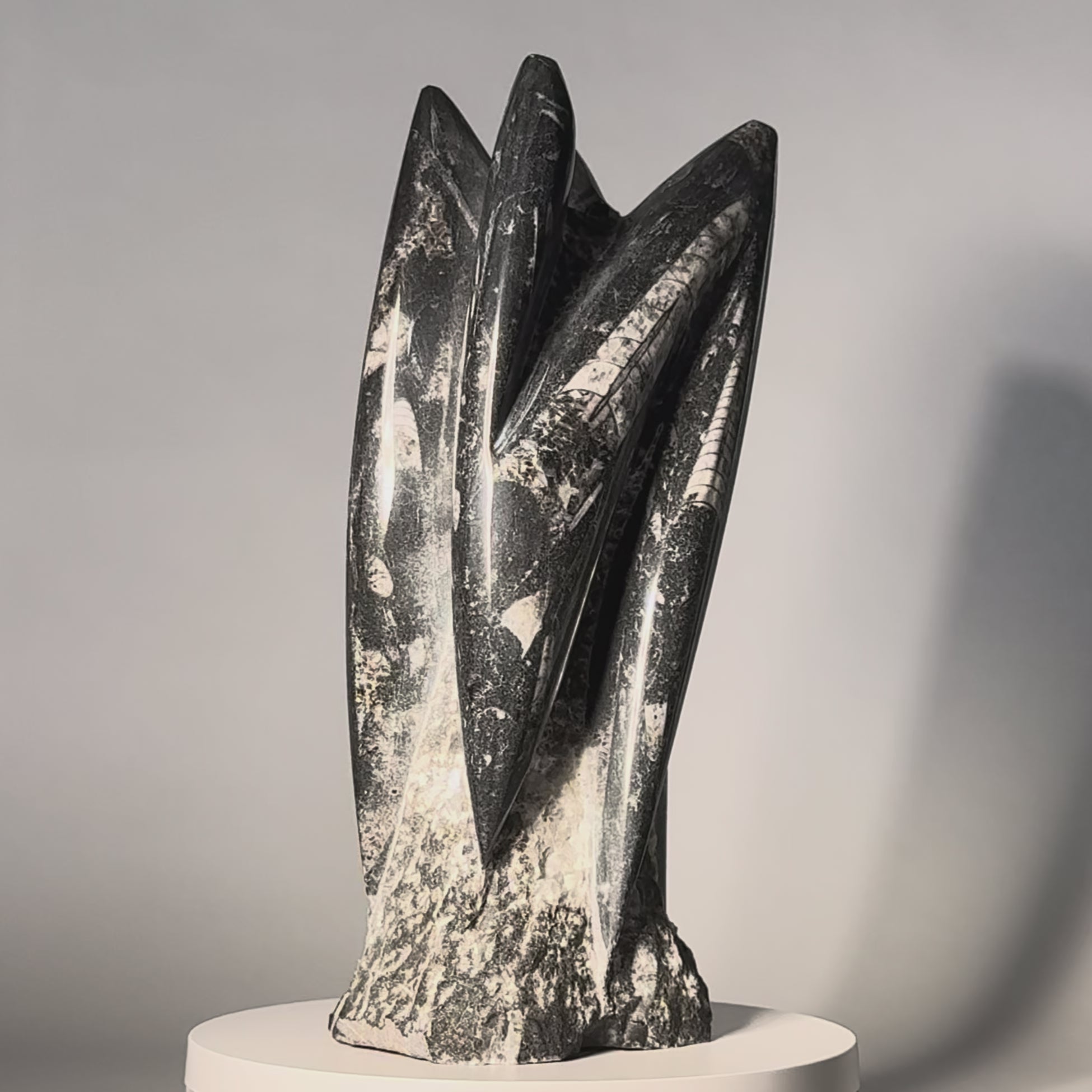 A tower of nautiloid cephalopod (squid/cuttlefish type) fossils. Cut and polished into striking shapes.