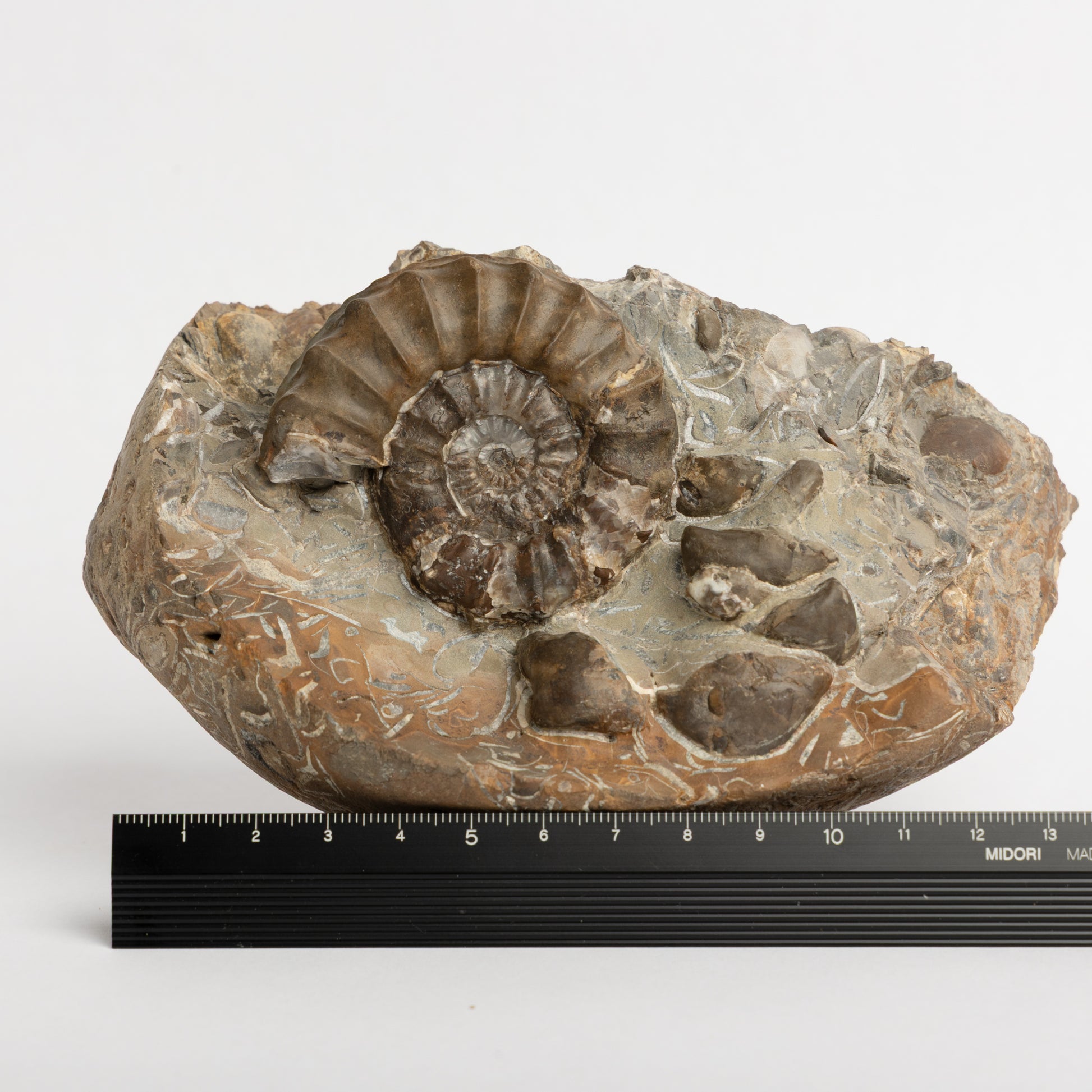 A nice example of Pleuroceras pausicostatum in a matrix filled with other fossilised shell material.